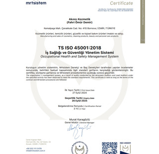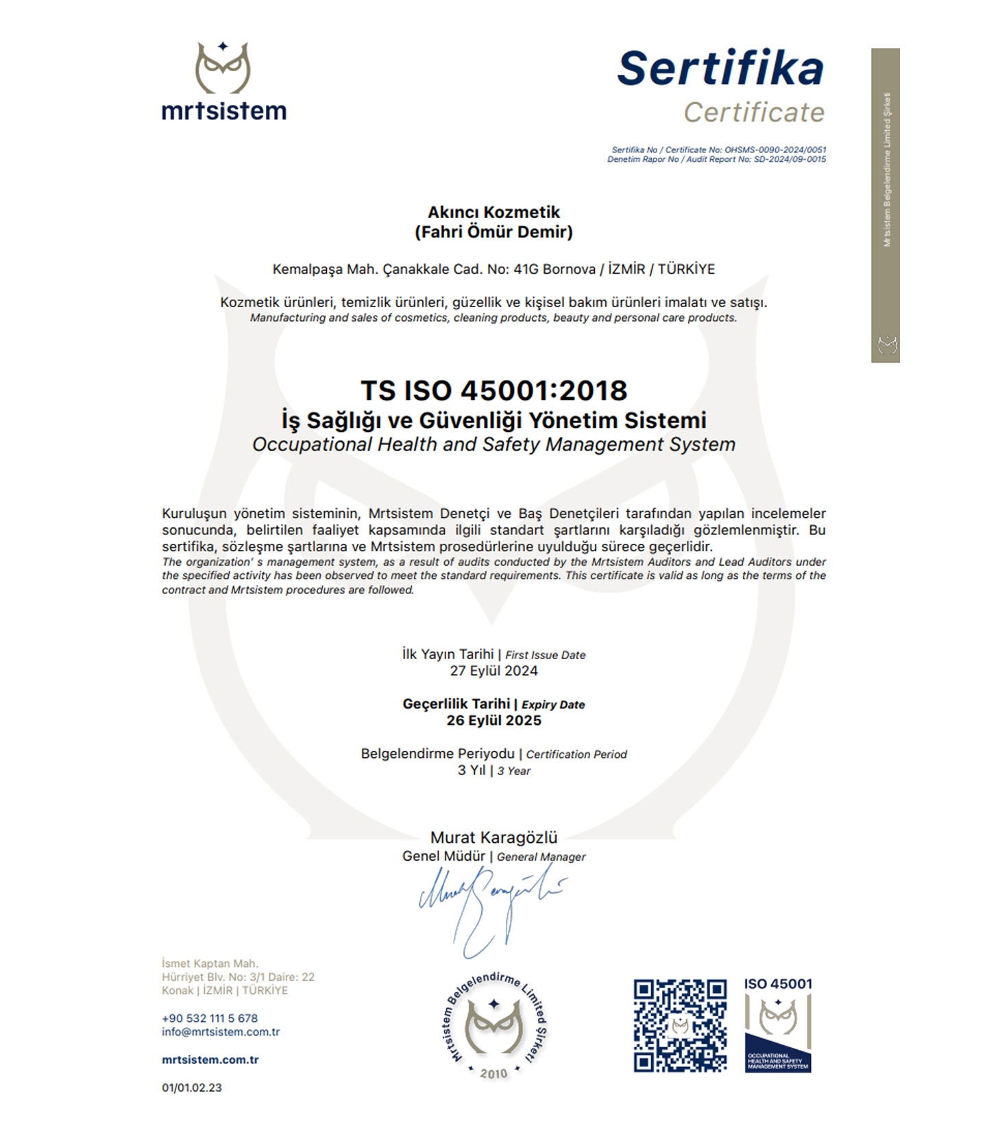 Akıncı Kozmetik olarak, TS ISO 10002:2018 standardına uygun olarak, müşteri şikayetlerini hızlı ve etkili bir şekilde ele alıyoruz. Bu sertifika, müşterilerimizin taleplerine duyarlı olduğumuzu, onların memnuniyetini ön planda tutarak her türlü şikayeti titizlikle işlediğimizi ve sürekli iyileştirme sağladığımızı gösterir.